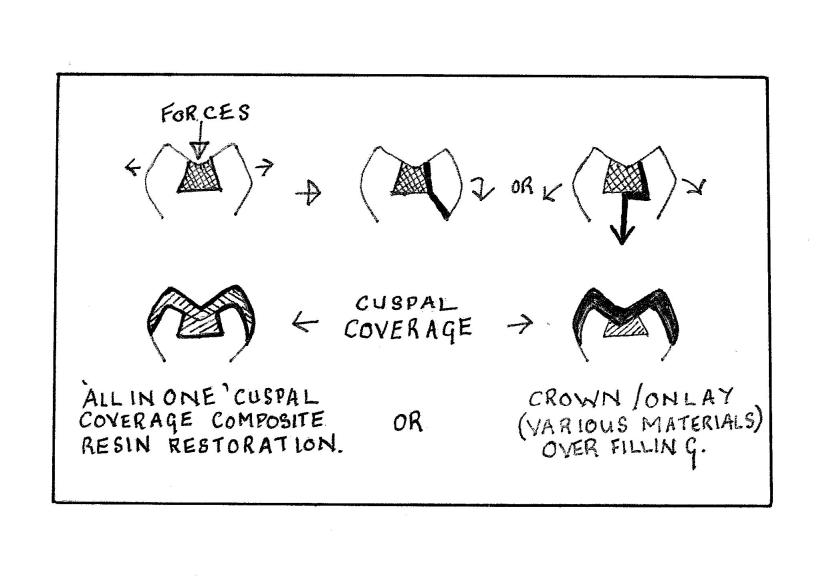 All this leads to me saying that if you are a person who has heavily restored teeth you will probably eventually need what is known as cuspal coverage on some of your teeth, that is something that goes over your tooth, down the sides a bit and changes the biting load on your tooth from a ‘point load’ in the center, to one that is more evenly distributed all over your tooth. Sometimes this can be achieved with a large ‘stick on’ filling, a composite resin restoration which not only fills up the cavity in your tooth but goes over the top of your cusps as well to hug your tooth and sometimes you will need a crown, a hat that goes over your tooth and basically ’holds the bits together’!