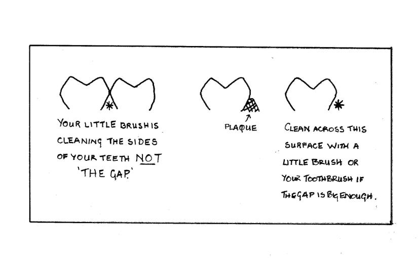 A tooth where there isn’t one next door. When you put your little brushes through between your teeth you are not cleaning the gap- its air! You are cleaning the 2 teeth on either side of the gap. So when one of those teeth is missing for some reason you still have to clean across this surface or it will never be cleaned and a big slug of plaque will sit on the bony ridge behind your tooth resulting in a cavity there. Use a little brush [a fairly large size] across that surface just as if you had a tooth next door. By the same logic you need to floss down the back of your last standing tooth, your floss is just a scraper, like scraping frost off a car windscreen with a credit card.